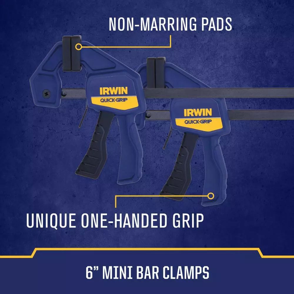 - Includes (2) QUICK-GRIP 12-in Mini One-Handed Bar Clamps, (2) QUICK-GRIP 6-in Mini One-Handed Bar Clamps, (2) QUICK-GRIP 2-in/50mm HANDI-CLAMP™ and (2) QUICK-GRIP 2-in Resin Spring Clamps