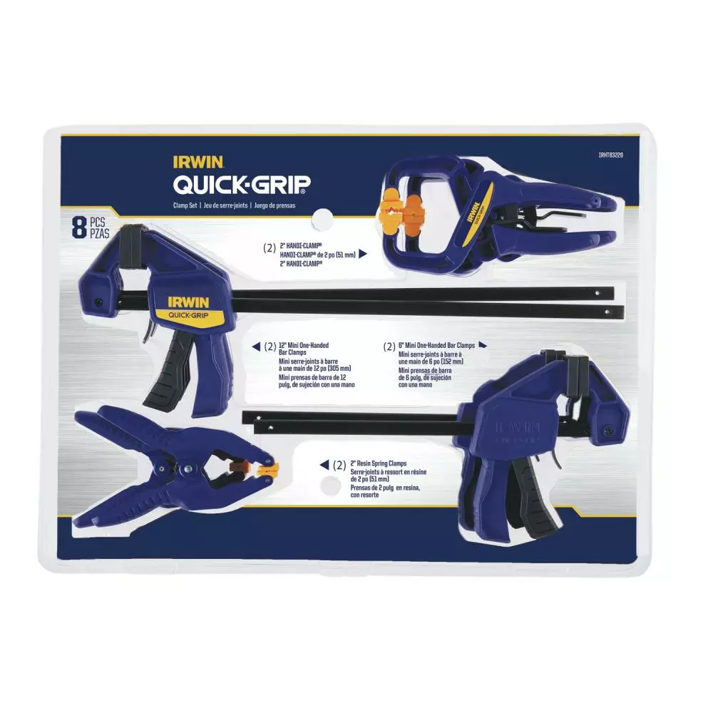 The IRWIN QUICK-GRIP clamp set includes four one-handed mini bar clamps, two hand-clamps, and two spring clamps ideal for smaller projects and clamping in confined spaces. The one-handed mini bar clamps have a patented pistol-grip design for increased comfort, non-marring pads to grip firmly and protect work, and exert up to 150 psi of pressure. The Hindi-clamps have quick-release triggers, a ratcheting mechanism to adjust clamp pressure, and significantly reduce the hand-force needed to generate pressure, making these clamps more comfortable to use. Constructed of durable, high-tech reinforced resin, these clamps are backed by the IRWIN lifetime guarantee.