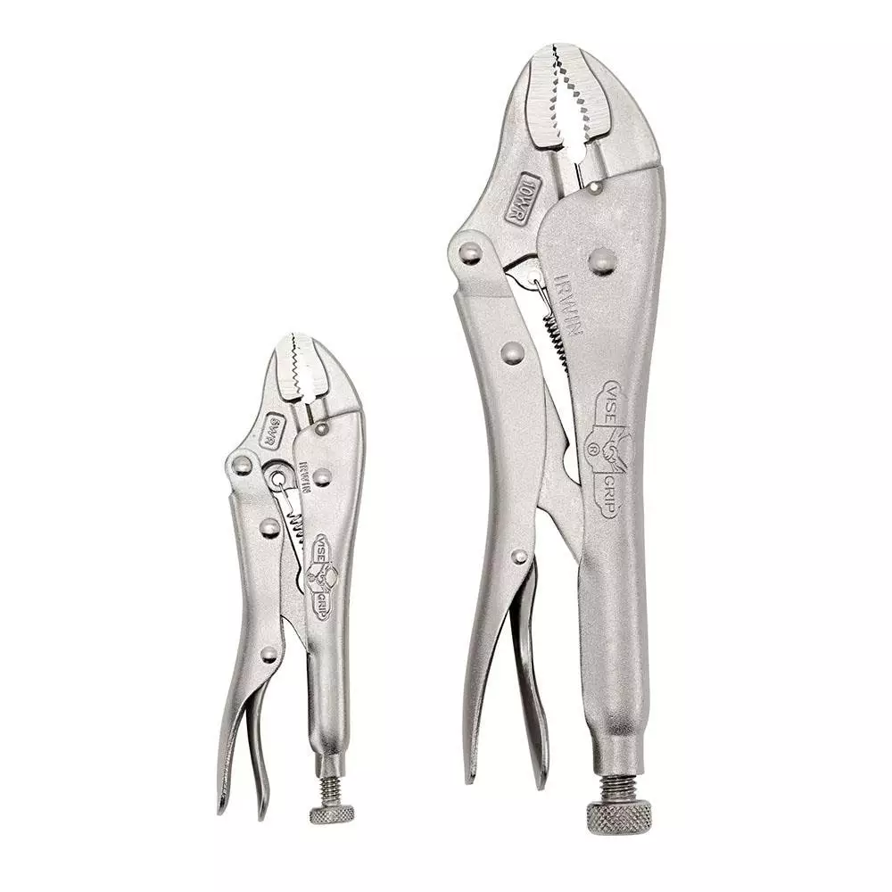The Irwin® 2-piece Original Locking Pliers Set Contains (1) 5-in and (1) 10-in curved jaw pliers. These two tools provide you with the versatility to do a variety of jobs. The 10WR features a curved jaw with wire cutter for a wide array of applications. The 5WR also features a curved jaw with wire cutter, and it’s compact size allows you to get into tight spaces and work with small parts. These locking tools are ideal for tightening, clamping, twisting and turning. Vise-Grips are constructed of high-grade heat-treated alloy steel for maximum toughness and durability.